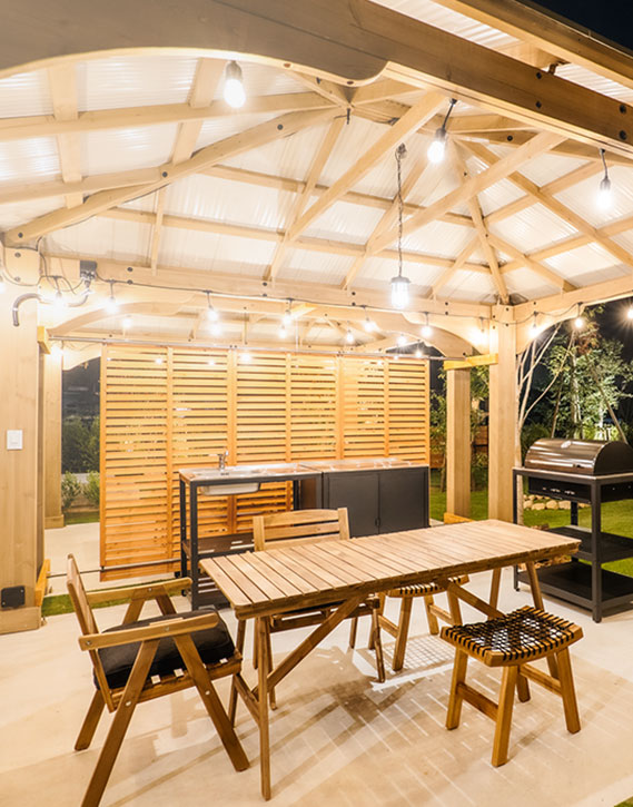 Kitchens are available both indoors and outdoors. You can try the professional chef's BBQ cooking experience.
